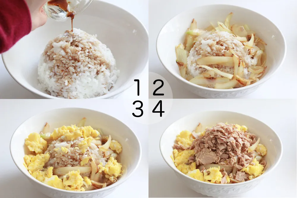 - 따뜻한 밥 위에 계란,참치,양파를 올립니다.